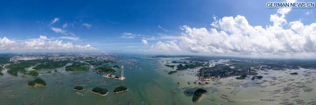 LINGSHAN, 28. August 2022 (Xinhuanet) -- Das am 27. August 2022 aufgenommene Panorama-Luftbild zeigt eine im Bau befindliche Brücke in der Nähe der Mündung des Kanals Pinglu in der Stadt Qinzhou im südchinesischen Autonomen Gebiet Guangxi der Zhuang. (Quelle: Xinhua/Cao Yiming)