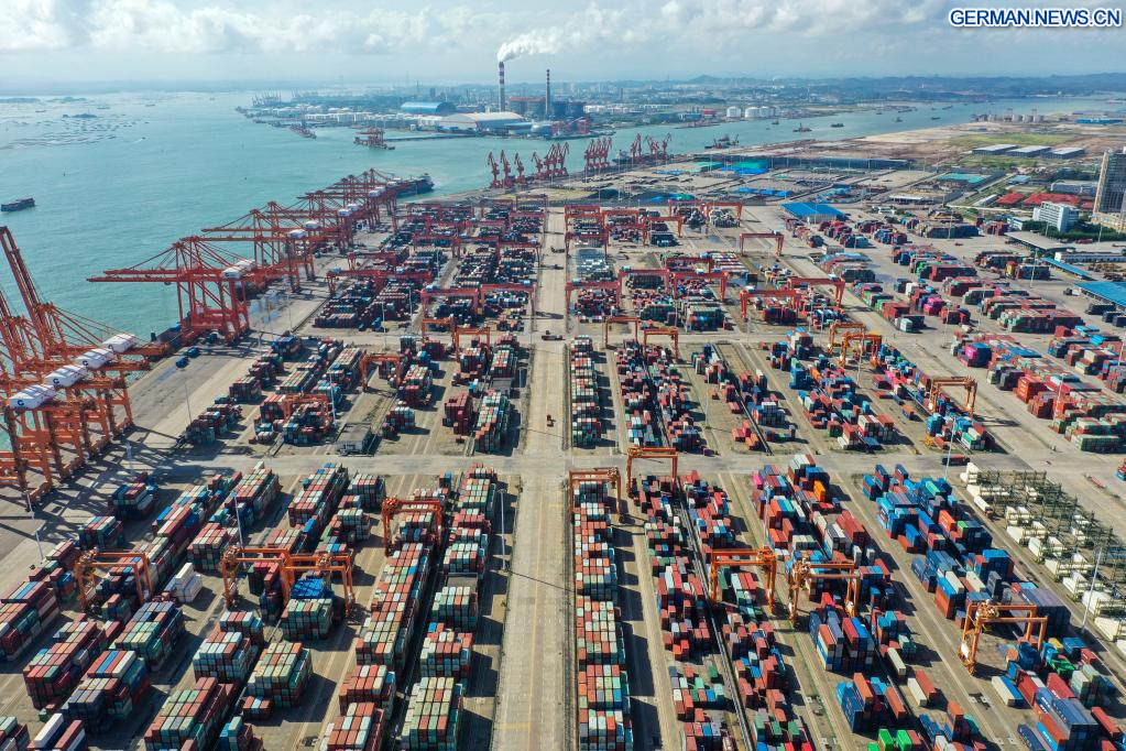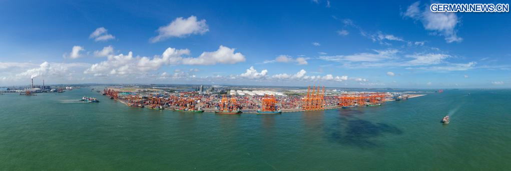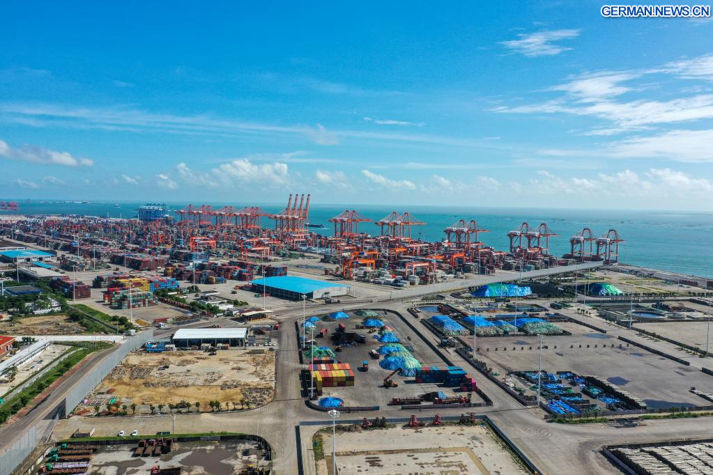 LINGSHAN, 28. August 2022 (Xinhuanet) -- Das am 27. August 2022 aufgenommene Luftbild zeigt den Hafen Qinzhou in der Nähe der Mündung des Kanals Pinglu in der Stadt Qinzhou im südchinesischen Autonomen Gebiet Guangxi der Zhuang. (Quelle: Xinhua/Cao Yiming)