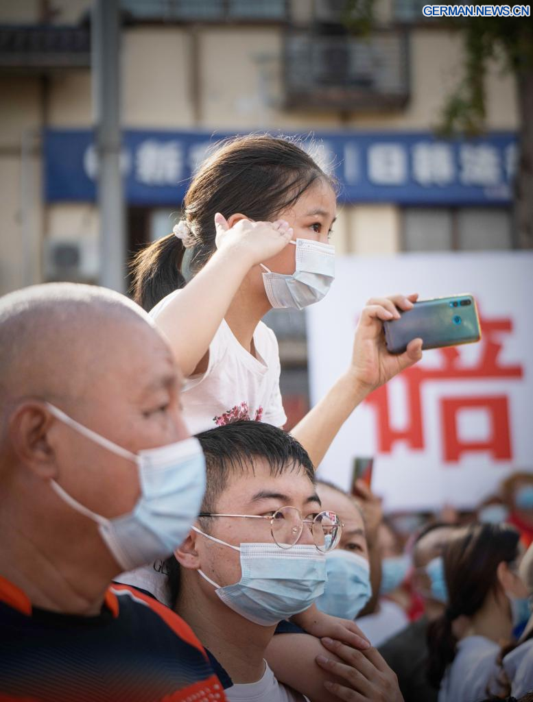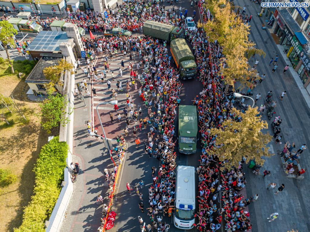 CHONGQING, 28. August 2022 (Xinhuanet) -- Das am 28. August 2022 aufgenommene Luftbild zeigt Bewohner, die Feuerwehrleute aus der Provinz Yunnan verabschieden, im Bezirk Beibei im südwestchinesischen Chongqing. Über 300 Feuerwehrleute aus der Provinz Yunnan verließen Chongqing, nachdem alle offenen Flammen der kürzlich in Chongqing ausgebrochenen Waldbrände gelöscht worden waren. (Quelle: Xinhua/Zhu Gaoxiang)
