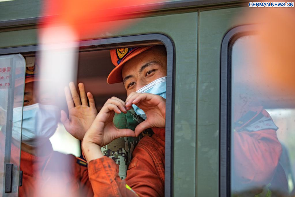 CHONGQING, 28. August 2022 (Xinhuanet) -- Ein Mädchen grüßt Feuerwehrleute aus der Provinz Yunnan im Bezirk Beibei im südwestchinesischen Chongqing, 28. August 2022. Über 300 Feuerwehrleute aus der Provinz Yunnan verließen Chongqing, nachdem alle offenen Flammen der kürzlich in Chongqing ausgebrochenen Waldbrände gelöscht worden waren. (Quelle: Xinhua/Zhu Gaoxiang)