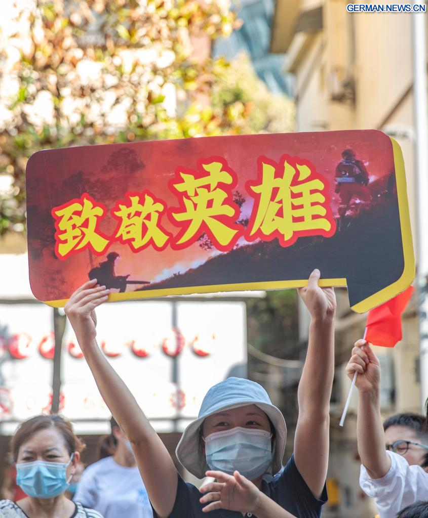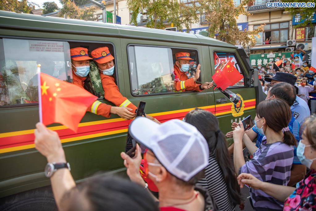 CHONGQING, 28. August 2022 (Xinhuanet) -- Bewohner verabschieden Feuerwehrleute aus der Provinz Yunnan im Bezirk Beibei im südwestchinesischen Chongqing, 28. August 2022. Über 300 Feuerwehrleute aus der Provinz Yunnan verließen Chongqing, nachdem alle offenen Flammen der kürzlich in Chongqing ausgebrochenen Waldbrände gelöscht worden waren. (Quelle: Xinhua/Huang Wei)
