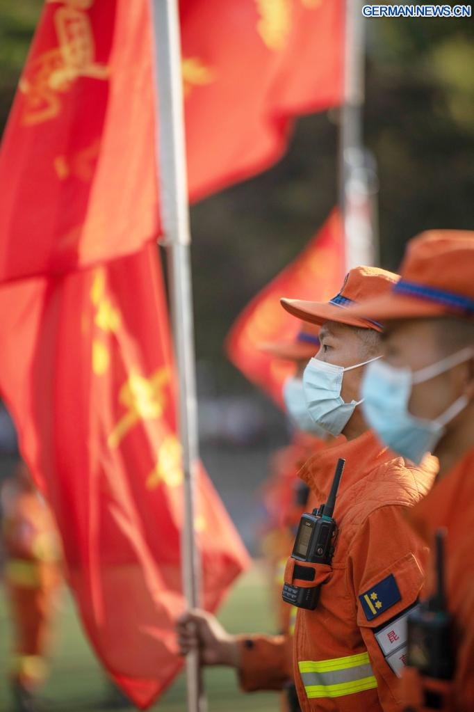 CHONGQING, 28. August 2022 (Xinhuanet) -- Feuerwehrleute aus der Provinz Yunnan versammeln sich vor dem Aufbruch im Bezirk Beibei im südwestchinesischen Chongqing, 28. August 2022. Über 300 Feuerwehrleute aus der Provinz Yunnan verließen Chongqing, nachdem alle offenen Flammen der kürzlich in Chongqing ausgebrochenen Waldbrände gelöscht worden waren. (Quelle: Xinhua/Zhu Gaoxiang)
