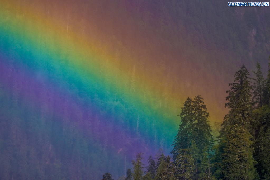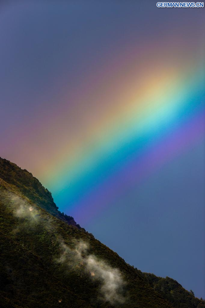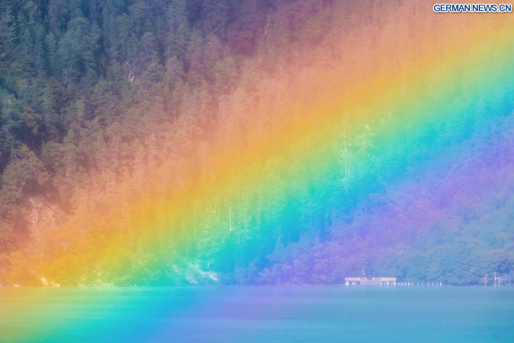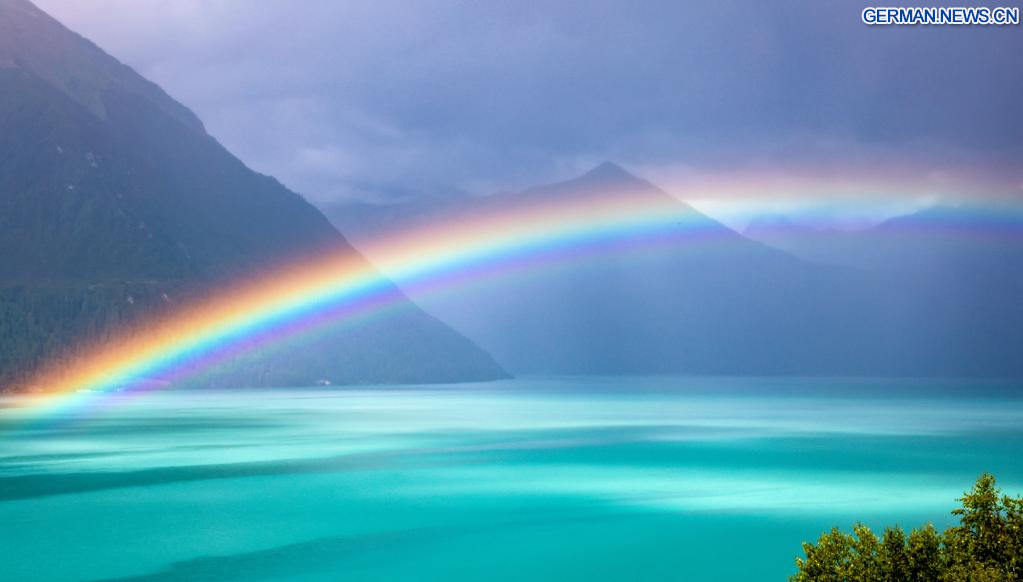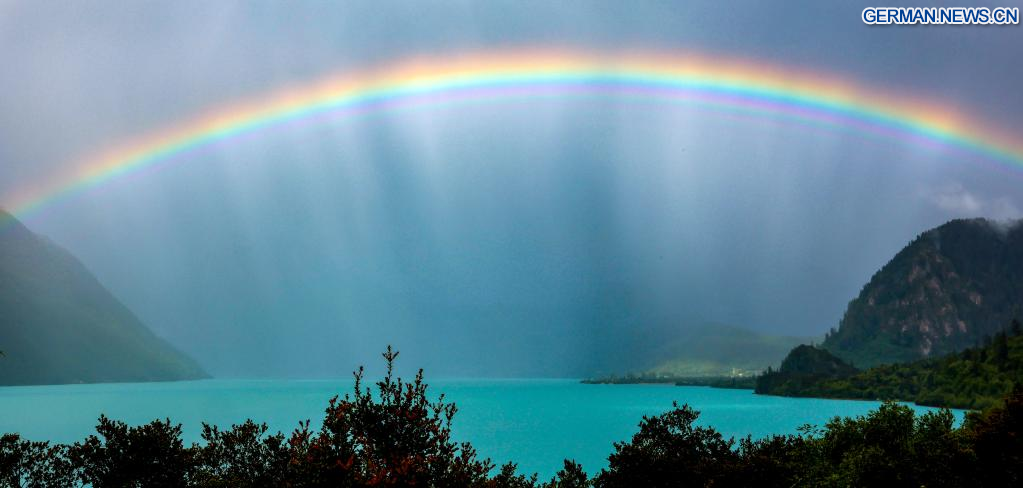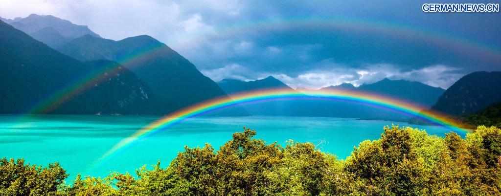 LHASA, 30. August 2022 (Xinhuanet) -- Ein Regenbogen erscheint am Himmel über dem Basum-See in der Stadt Nyingchi im südwestchinesischen Autonomen Gebiet Tibet, 29. August 2022. (Quelle: Xinhua/Jiang Fan)