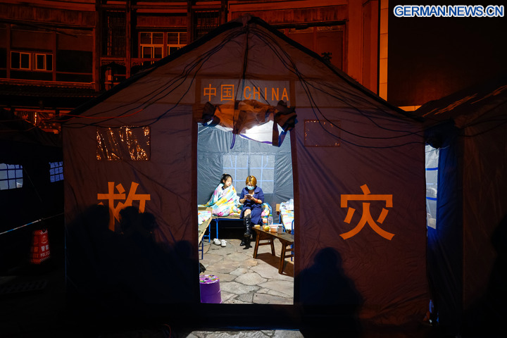 Von dem Erdbeben betroffene Anwohner ruhen sich in einem Zelt in einer Notunterkunft in der Gemeinde Moxi im Kreis Luding in der Provinz Sichuan im Südwesten Chinas aus, 5. September 2022. (Xinhua/Shen Bohan)