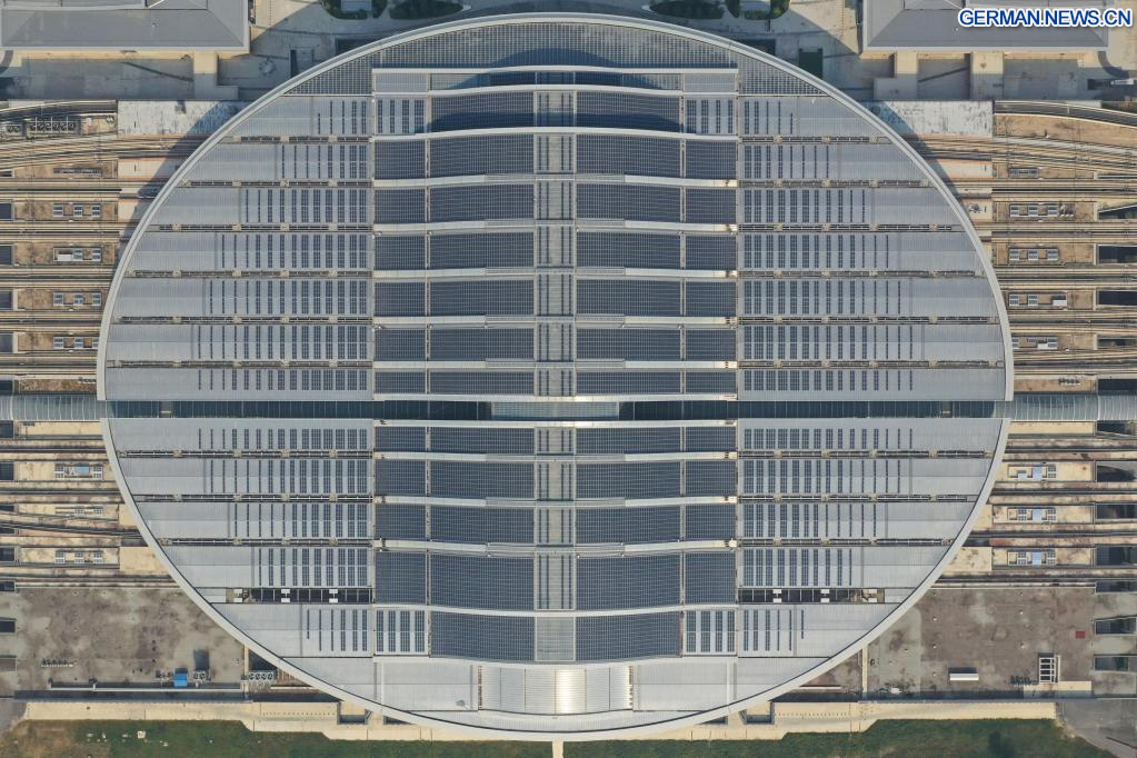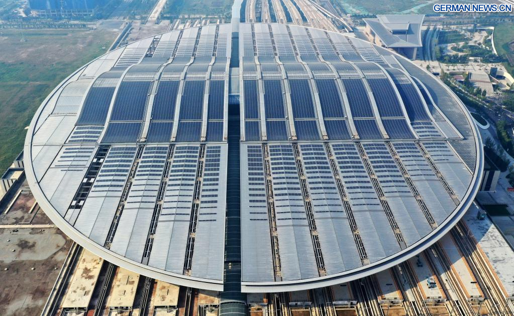 XIONG'AN, 10. September 2022 (Xinhuanet) -- Das am 9. September 2022 aufgenommene Luftbild zeigt ein verteiltes Photovoltaikkraftwerk auf dem Dach des Bahnhofs Xiong'an in der Xiong'an New Area der nordchinesischen Provinz Hebei. (Quelle: Xinhua/Xing Guangli)