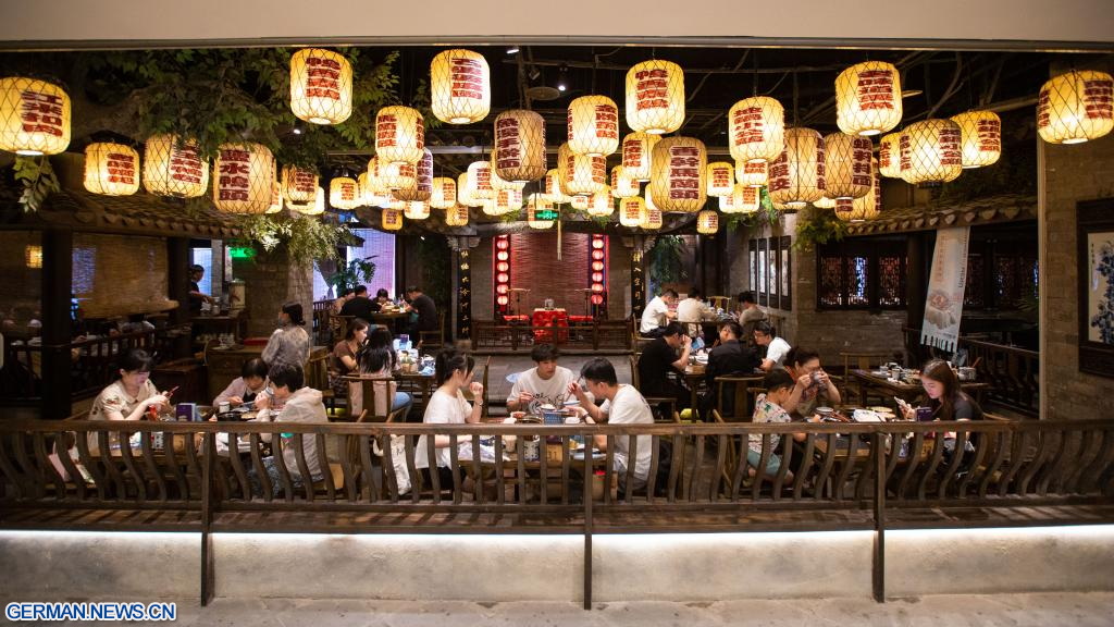 NANJING, 11. September 2022 (Xinhuanet) -- Menschen speisen in einem Restaurant während der Feiertage zum Mondfest in Nanjing in der ostchinesischen Provinz Jiangsu, 11. September 2022. Die dreitägigen Feiertage zum Mondfest begannen dieses Jahr am 10. September. (Quelle: Xinhua/Su Yang)