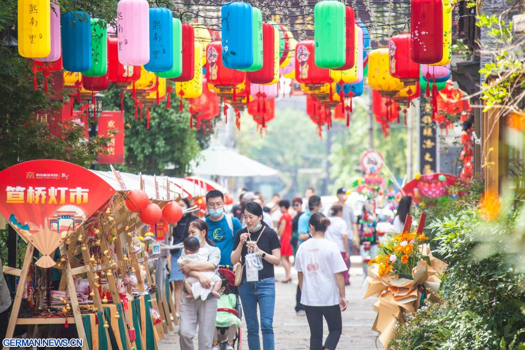 NANJING, 11. September 2022 (Xinhuanet) -- Menschen besuchen einen Laternenmarkt während der Feiertage zum Mondfest in Nanjing in der ostchinesischen Provinz Jiangsu, 11. September 2022. Die dreitägigen Feiertage zum Mondfest begannen dieses Jahr am 10. September. (Quelle: Xinhua/Sun Zhongnan)