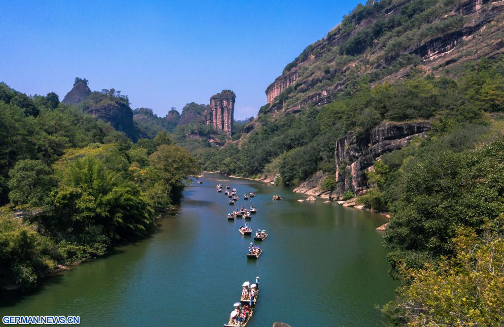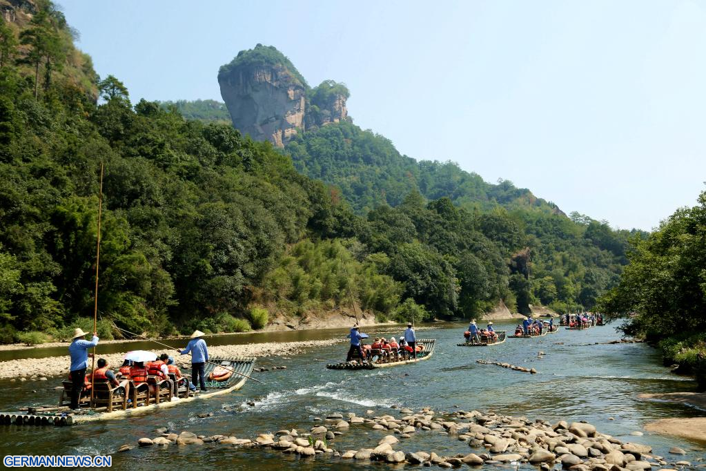 WUYISHAN, 11. September 2022 (Xinhuanet) -- Menschen nehmen Bambusflöße, um während der Feiertage zum Mondfest im Wuyishan-Nationalpark in der südostchinesischen Provinz Fujian die Landschaft zu genießen, 11. September 2022. Die dreitägigen Feiertage zum Mondfest begannen dieses Jahr am 10. September. (Quelle: Xinhua/Chen Ying)