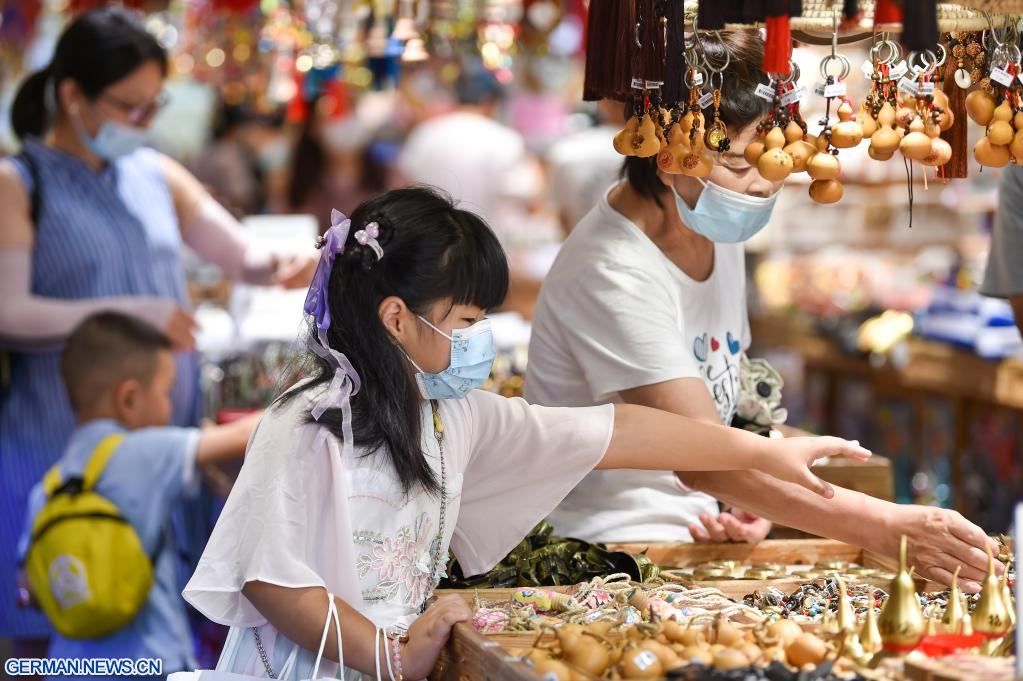 NANJING, 11. September 2022 (Xinhuanet) -- Menschen kaufen in einem Souvenirladen im Touristengebiet Konfuzius-Tempel während der Feiertage zum Mondfest in Nanjing in der ostchinesischen Provinz Jiangsu ein, 11. September 2022. Die dreitägigen Feiertage zum Mondfest begannen dieses Jahr am 10. September. (Quelle: Xinhua/Fang Dongxu)