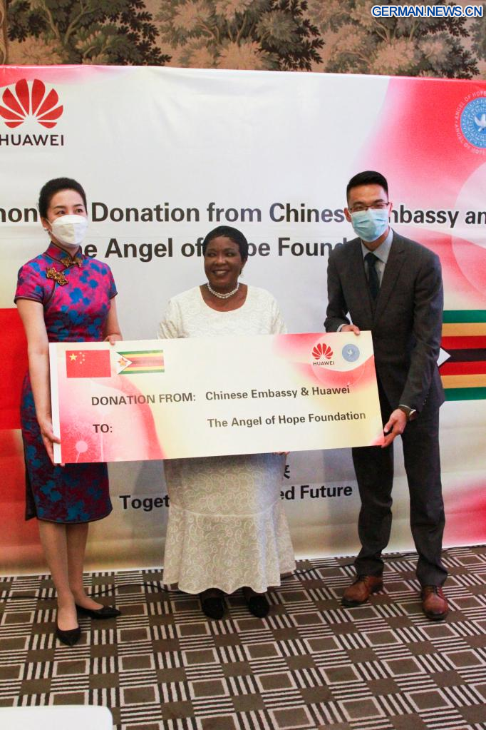 HARARE, 12. September 2022 (Xinhuanet) -- Wang Wei (l.), Botschaftsrätin der chinesischen Botschaft in Simbabwe, und Wei Qingtao (r.), Geschäftsführer von Huawei's Technologies Zimbabwe, übergeben eine Spende von Huawei Simbabwe und der chinesischen Botschaft an die simbabwische First Lady und Schirmherrin des Programms "Samen für die Zukunft" Auxillia Mnangagwa für ihre Wohltätigkeitsorganisation, in Harara, Simbabwe, 12. September 2022. Das Telekommunikationsunternehmen Huawei Simbabwe startete am Montag die Veranstaltung 2022 des Programms "Samen für die Zukunft", in dessen Rahmen 30 Universitätsstudenten eine einwöchige virtuelle Schulung absolvieren werden, um ihre Kenntnisse und Fähigkeiten im Bereich der Informations- und Kommunikationstechnologie (IKT) zu verbessern. (Quelle: Xinhua/Tafara Mugwara)