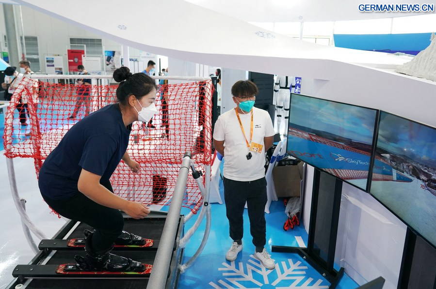 Eine Frau testet einen Skisimulator auf der Ausstellung für Sportdienstleistungen während der China International Fair for Trade in Services (CIFTIS) 2022 in Chinas Hauptstadt Beijing, 2. September 2022. (Xinhua/Zhang Chenlin)