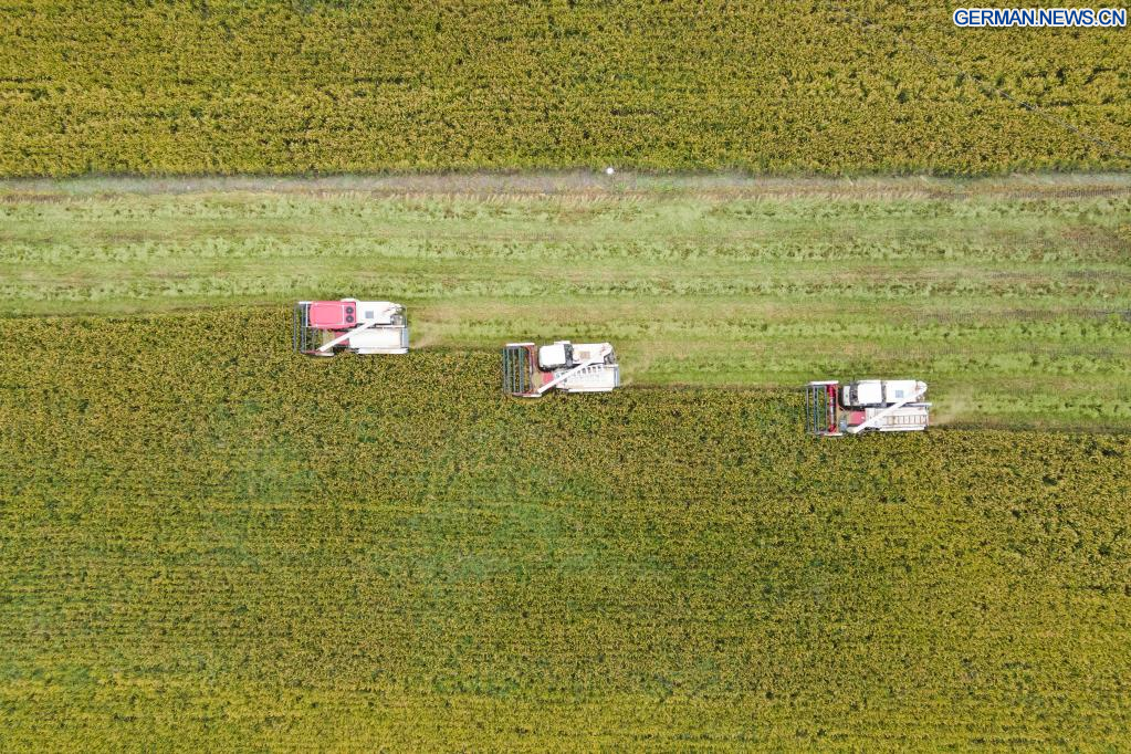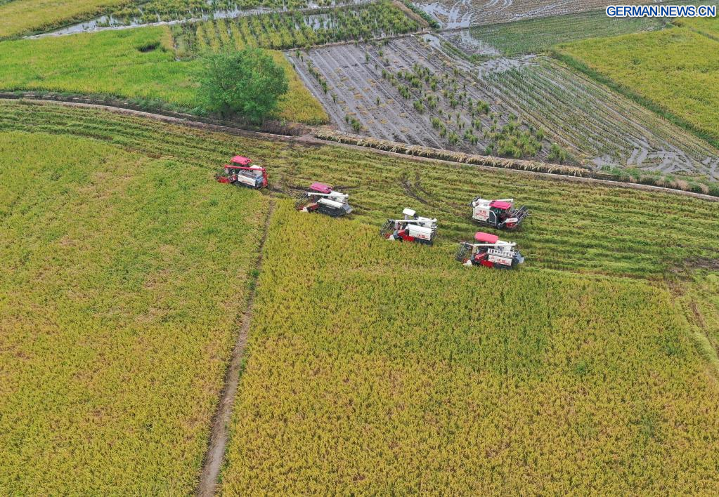 CHENGDU, 22. September 2022 (Xinhuanet) -- Das am 22. September 2022 aufgenommene Luftbild zeigt Erntemaschinen bei der Arbeit auf einem Reisfeld im Dorf Shanhe in Chengdu der südwestchinesischen Provinz Sichuan. (Quelle: Xinhua/Liu Kun)