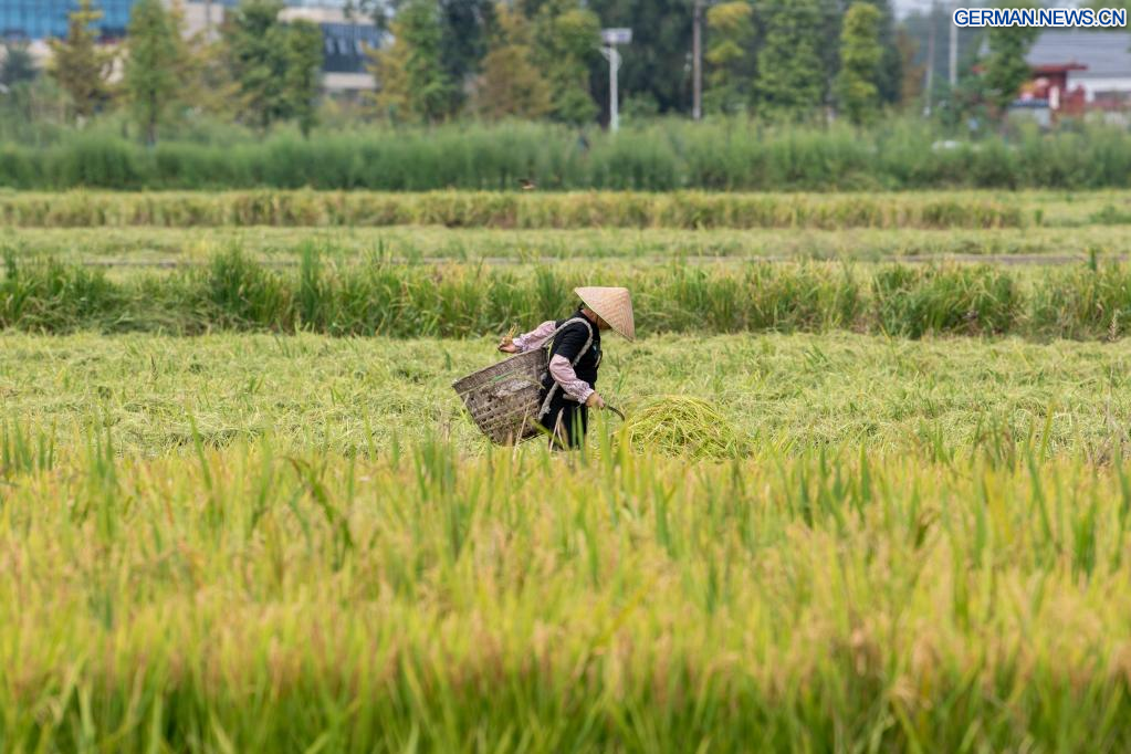 CHENGDU, 22. September 2022 (Xinhuanet) -- Ein Dorfbewohner erntet Rohreis im Dorf Xinhua von Chongzhou der südwestchinesischen Provinz Sichuan, 21. September 2022. (Quelle: Xinhua/Xu Bingjie)