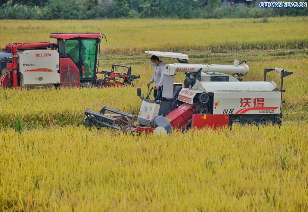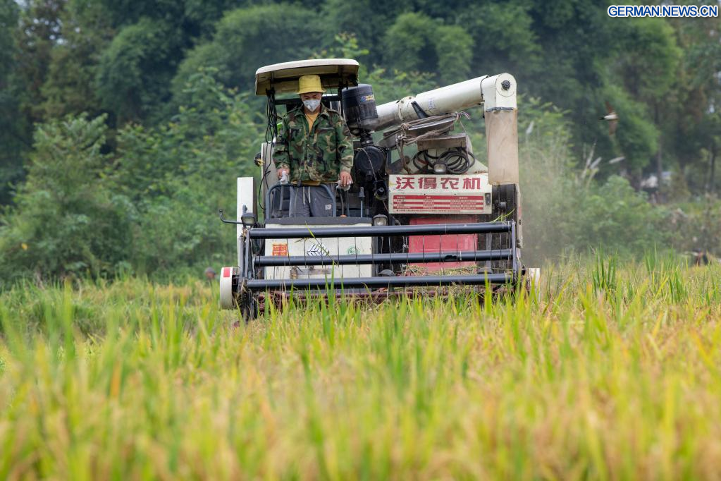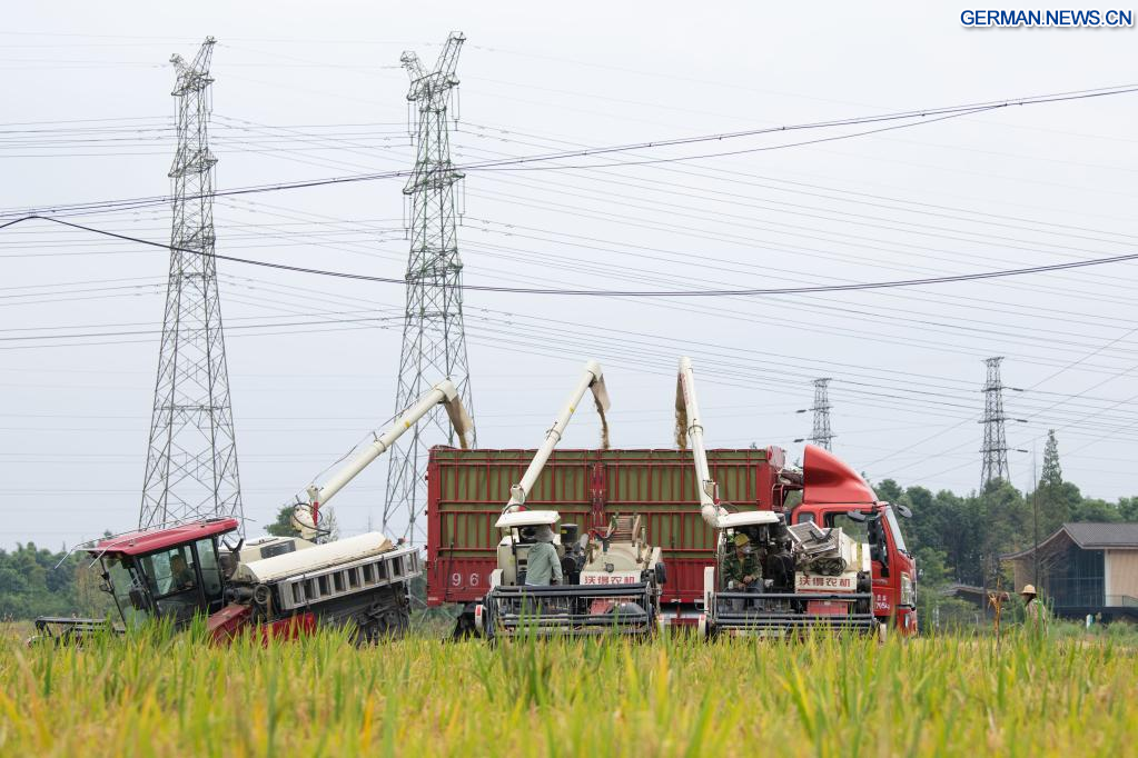 CHENGDU, 22. September 2022 (Xinhuanet) -- Bauern, die Erntemaschinen fahren, arbeiten auf einem Reisfeld im Dorf Shanhe in Chengdu der südwestchinesischen Provinz Sichuan, 22. September 2022. (Quelle: Xinhua/Liu Kun)