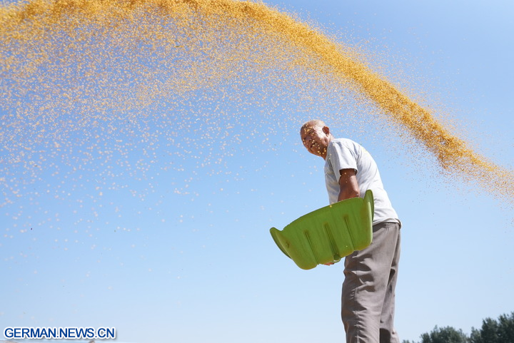 BEIJING, 24. September 2022 (Xinhua) -- Ein Landwirt trocknet Getreide im Dorf Wucun im Kreis Nanhe in der Stadt Xingtai in der Provinz Hebei in Nordchina, 22. September 2022. Das chinesische Erntefest findet jedes Jahr zur Tag- und Nachtgleiche zu Herbstbeginn statt und fällt in diesem Jahr auf den 23. September. (Foto von Geng Zhao/Xinhua)