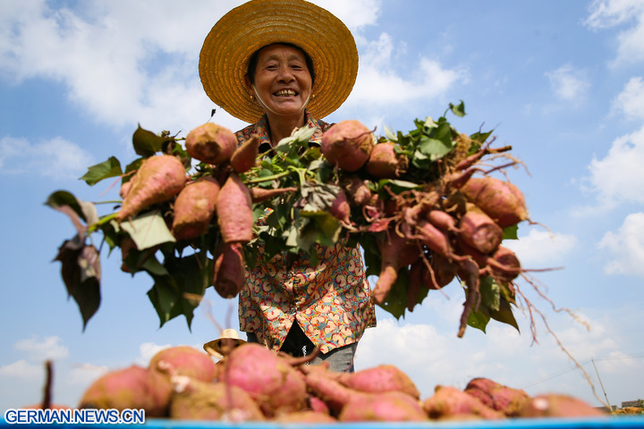 BEIJING, 24. September 2022 (Xinhua) -- Eine Dorfbewohnerin zeigt geerntete Süßkartoffeln im Dorf Cangtou in der Stadt Jurong in der Provinz Jiangsu in Ostchina, 22. September 2022. Das chinesische Erntefest findet jedes Jahr zur Tag- und Nachtgleiche zu Herbstbeginn statt und fällt in diesem Jahr auf den 23. September. (Foto von Zhong Xueman/Xinhua)
