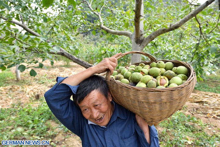 BEIJING, 24. September 2022 (Xinhua) -- Ein Dorfbewohner trägt frisch geerntete Walnüsse in einem Anbaugebiet im Dorf Dalin im Kreis Baokang in der Stadt Xiangyang in der Provinz Hubei in Zentralchina, 15. September 2022. Das chinesische Erntefest findet jedes Jahr zur Tag- und Nachtgleiche zu Herbstbeginn statt und fällt in diesem Jahr auf den 23. September. (Foto von Yang Tao/Xinhua)