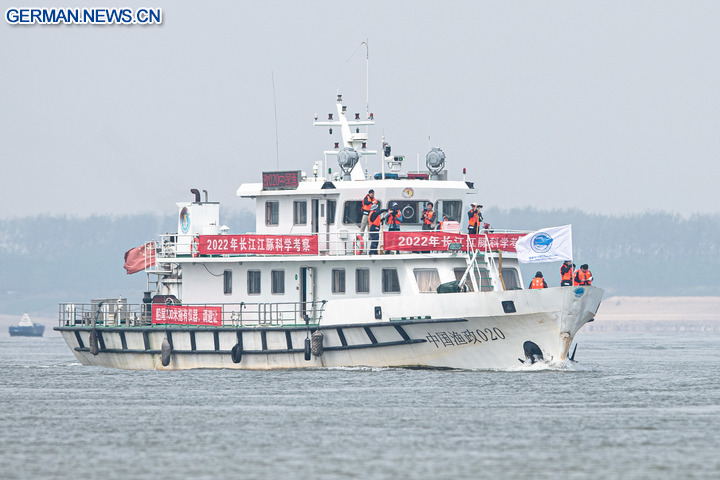 WUHAN, 25. September 2022 (Xinhua) -- Das Foto zeigt ein Schiff für wissenschaftliche Forschung zum Glattschweinswal im Abschnitt des Jangtse-Flusses in Jianli in der Provinz Hubei in Zentralchina, 24. September 2022. China begann am Montag mit einer wissenschaftlichen Untersuchung zum Glattschweinswal, eine ikonische Art im Jangtse, dem längsten Fluss des Landes. Ziel ist es, einen zielgerichteteren Plan für den Schutz dieser Art zu formulieren. Die von der Fischereiverwaltung für das Flussbecken des Jangtse des Ministeriums für Landwirtschaft und ländliche Angelegenheiten organisierte Expedition wurde gemeinsam von den lokalen Fischereibehörden von sechs Regionen auf Provinzebene, wissenschaftlichen Forschungseinrichtungen sowie sozialen Organisationen begonnen. Während der wissenschaftlichen Expedition werden Daten über die Population und die Verbreitung von Schweinswalen sowie über die Umwelt in ihren Lebensräumen gesammelt. So werden mögliche Bedrohungsfaktoren für die Art ermittelt und die Wirkung der derzeitigen Schutzmaßnahmen bewertet. Der Jangtse-Glattschweinswal steht unter höchstem staatlichem Schutz und ist ein wichtiger Indikator für den Zustand der Ökologie des Jangtse-Flusses. Bei einer Untersuchung im Jahr 2017 wurde ein Bestand von 1.012 Glattschweinswalen im Jangtse ermittelt. (Xinhua/Xiao Yijiu)