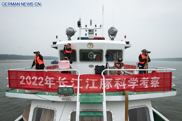 WUHAN, 25. September 2022 (Xinhua) -- Das Foto zeigt Forscher mit Ferngläsern bei der Beobachtung von Glattschweinswalen während einer wissenschaftlichen Expedition im Abschnitt des Jangtse-Flusses bei Shishou in der Provinz Hubei in Zentralchina, 23. September 2022. China begann am Montag mit einer wissenschaftlichen Untersuchung zum Glattschweinswal, eine ikonische Art im Jangtse, dem längsten Fluss des Landes. Ziel ist es, einen zielgerichteteren Plan für den Schutz dieser Art zu formulieren. Die von der Fischereiverwaltung für das Flussbecken des Jangtse des Ministeriums für Landwirtschaft und ländliche Angelegenheiten organisierte Expedition wurde gemeinsam von den lokalen Fischereibehörden von sechs Regionen auf Provinzebene, wissenschaftlichen Forschungseinrichtungen sowie sozialen Organisationen begonnen. Während der wissenschaftlichen Expedition werden Daten über die Population und die Verbreitung von Schweinswalen sowie über die Umwelt in ihren Lebensräumen gesammelt. So werden mögliche Bedrohungsfaktoren für die Art ermittelt und die Wirkung der derzeitigen Schutzmaßnahmen bewertet. Der Jangtse-Glattschweinswal steht unter höchstem staatlichem Schutz und ist ein wichtiger Indikator für den Zustand der Ökologie des Jangtse-Flusses. Bei einer Untersuchung im Jahr 2017 wurde ein Bestand von 1.012 Glattschweinswalen im Jangtse ermittelt. (Xinhua/Xiao Yijiu)
