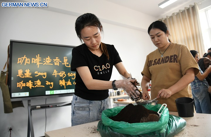 XI'AN, 26. September 2022 (Xinhua) -- Auszubildende treffen Vorbereitungen zur Herstellung von Seifenstücken aus Kaffeesatz an der Shaanxi Urban Economy School in Xi'an, der Hauptstadt der Provinz Shaanxi im Nordwesten Chinas, 22. September 2022. Der Internationale Tag der Gehörlosen fällt jedes Jahr auf den vierten Sonntag im September. Seit 2019 bietet die Shaanxi Urban Economy School eine kostenlose Barista-Schulung für Hörgeschädigte an. Die Auszubildenden können im Rahmen des Schulungsprogramms Fertigkeiten in der Kaffeezubereitung sowie Kenntnisse über den Betrieb eines Cafés erwerben. Dies kann ihnen bei der Gründung eines eigenen Kaffeebetriebs oder der Aufnahme einer Beschäftigung in dieser Branche helfen. Bislang arbeiten mehr als 20 Absolventen des Schulungsprogramms in Cafés an verschiedenen Orten in China. (Xinhua/Li Yibo)