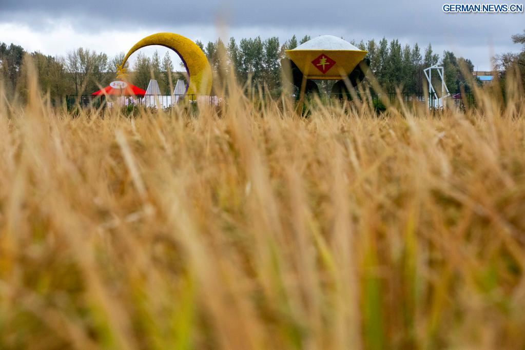 HARBIN, 3. Oktober 2022 (Xinhuanet) -- Touristen amüsieren sich auf einem Reisfeld der Yanjiagang Farm Co. Ltd. der Beidahuang Group in der nordostchinesischen Provinz Heilongjiang, 2. Oktober 2022. (Quelle: Xinhua/Wang Jianwei)