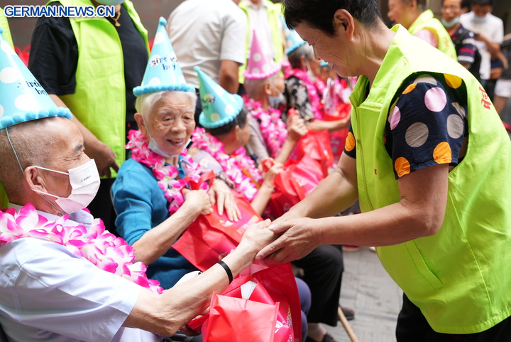 NANCHANG, 5. Oktober 2022 (Xinhua) -- Freiwillige nehmen an einer Geburtstagsfeier mit älteren Einwohnern im Stadtbezirk Donghu in Nanchang in der Provinz Jiangxi in Ostchina teil, 29. September 2022. Ein Freiwilligenprojekt namens "Zeitbank" für ältere Bürger wird seit 2017 im Stadtbezirk Donghu von Nanchang durchgeführt. Das Projekt ermutigt gesunde ältere Menschen und andere Freiwillige, ehrenamtliche Dienste für Senioren über 80 Jahre in der Gemeinde zu leisten. Auch andere bedürftige ältere Menschen werden in das Projekt einbezogen. Die Freiwilligen können ihre Dienstnachweise bei der "Zeitbank" hinterlegen und erhalten im Gegenzug verschiedene Waren oder können Seniorenbetreuungsdienste für sich selbst in Anspruch nehmen. (Xinhua/Peng Zhaozhi)