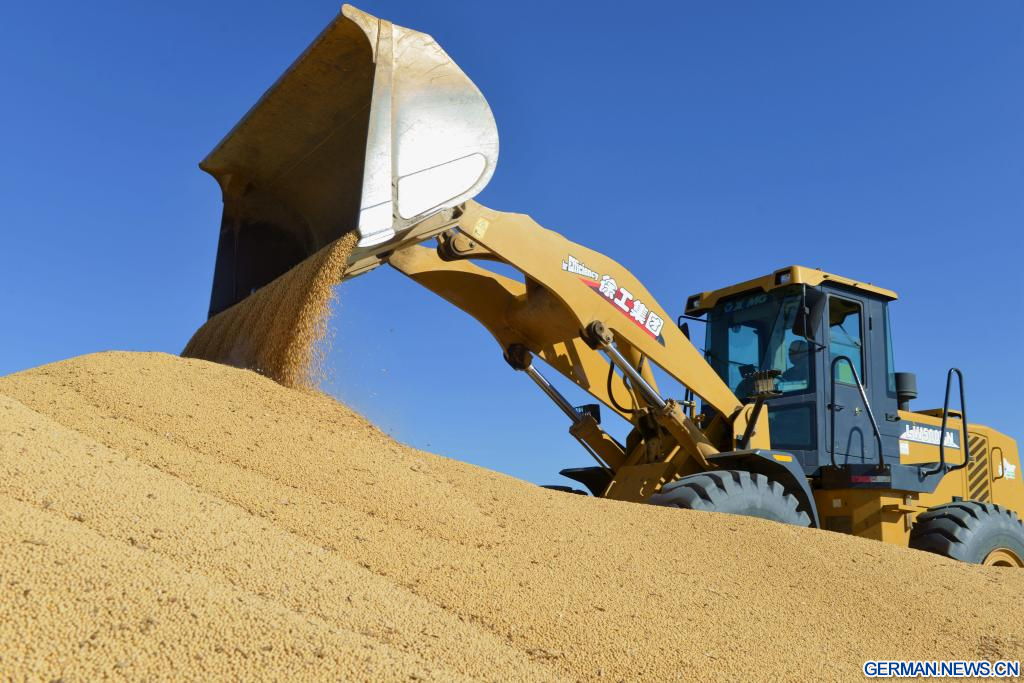 BEIJING, 4. Oktober 2024 (Xinhuanet) -- Ein Schaufellader transportiert Sojabohnen auf einer Farm der Beidahuang-Gruppe in der nordostchinesischen Provinz Heilongjiang, 3. Oktober 2024. (Foto von Qian Boyu/Xinhua)