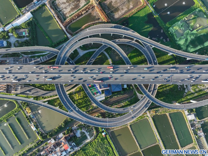 GUANGZHOU, 4. Oktober 2024 (Xinhua) -- Ein Luftbild, das am 2. Okt. 2024 aufgenommen wurde, zeigt eine Ansicht einer Autobahnüberführung auf der Nansha-Brücke, die die Städte Guangzhou und Dongguan verbindet, auf der Haiou-Insel im Gebiet des Perlflussdeltas in Guangzhou in der südchinesischen Provinz Guangdong. (Xinhua/Liu Dawei)