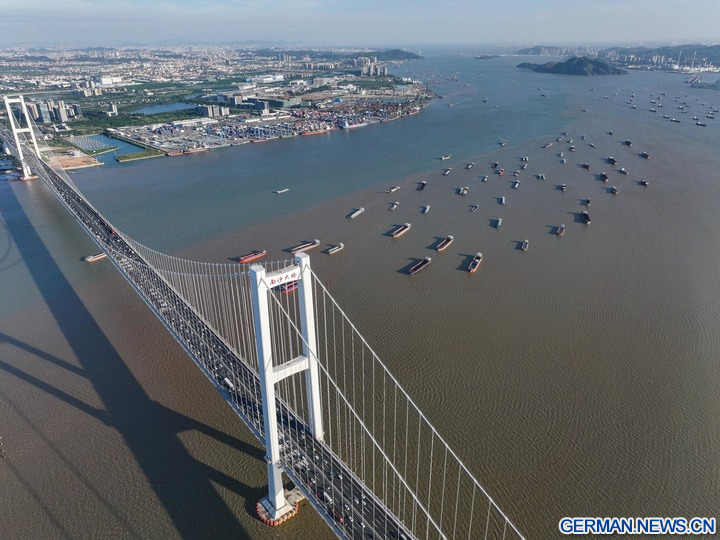GUANGZHOU, 4. Oktober 2024 (Xinhua) -- Die Luftaufnahme einer Drohne zeigt einen Blick auf die Nansha-Brücke, die die Städte Guangzhou und Dongguan verbindet, sowie auf Schiffe auf dem Shiziyang-Kanal im Gebiet des Perlflussdeltas in der Provinz Guangdong in Südchina, 2. Oktober 2024. (Xinhua/Liu Dawei)