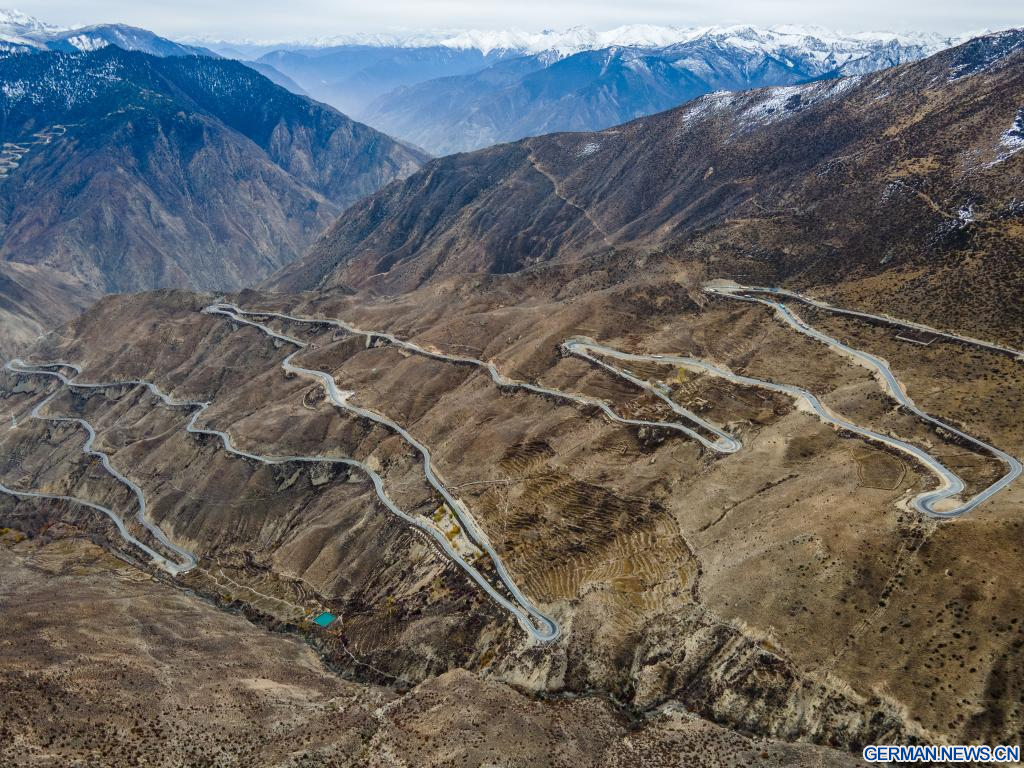 CHENGDU, 10. November 2024 (Xinhuanet) -- Die Luftaufnahme einer Drohne vom 7. November 2024 zeigt die Nationalstraße 318 (Code G318) in Baxoi, Qamdo, im südwestchinesischen Autonomen Gebiet Xizang. (Quelle: Xinhua/Chu Jiayin)