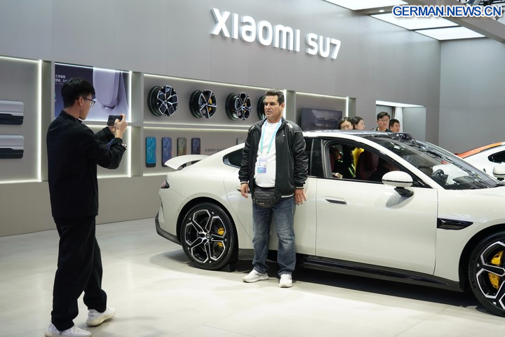 BEIJING, 30. November 2024 (Xinhua) -- Ein Besucher posiert für Fotos mit einem Auto am Stand von Xiaomi auf der 2. Chinesischen Internationalen Lieferkettenmesse (CISCE) in Chinas Hauptstadt Beijing, 28. November 2024. Im Ausstellungsbereich der Messe für intelligente Fahrzeuge werden Schlüsseltechnologien und -produkte entlang der gesamten industriellen Lieferkette intelligenter Fahrzeuge präsentiert, von Kernrohstoffen über Schlüsselkomponenten bis hin zu relevanten Dienstleistungen.