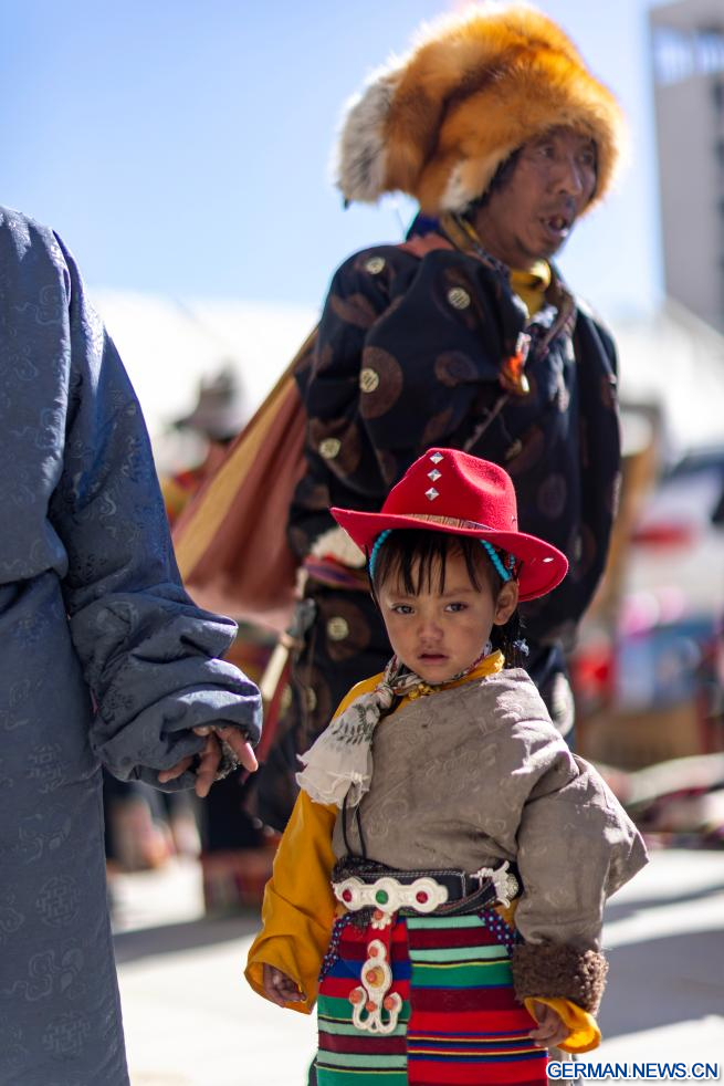 SHANNAN, 17. Dezember 2024 (Xinhuanet) -- Eine Bewohnerin verkauft handgefertigte Produkte auf einer Handelsmesse am Umsiedlungsort Singpori in Shannan im südwestchinesischen Autonomen Gebiet Xizang, 17. Dezember 2024. Am Dienstag begann eine sechstägige Handelsmesse am Umsiedlungsort Singpori, an dem mehr als 30.000 umgesiedelte Bewohner leben.