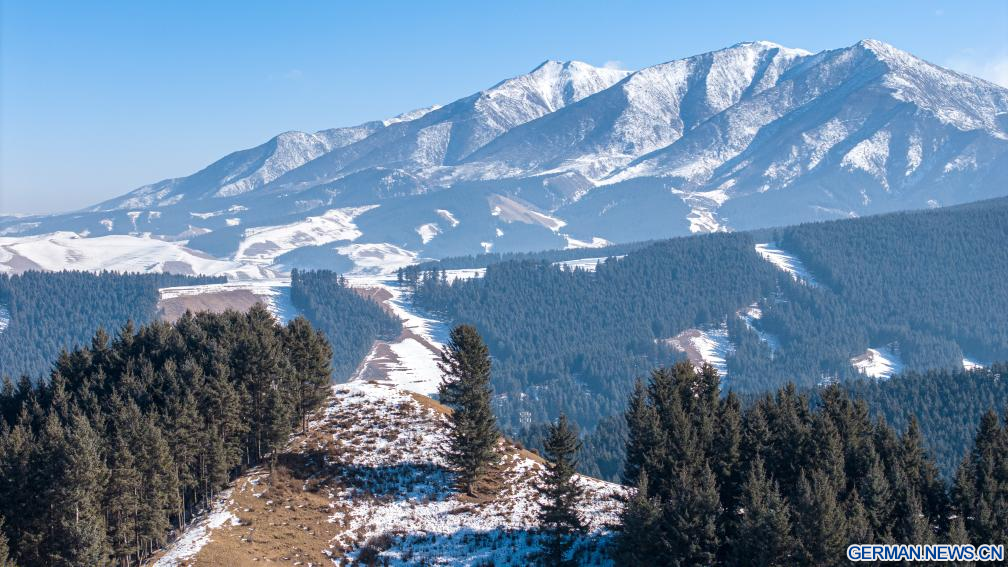 WUWEI, 16. Januar 2025 (Xinhuanet) -- Das Drohnenfoto vom 15. Januar 2025 zeigt die Schneelandschaft des Qilian-Gebirges im Kreis Tianzhu der Stadt Wuwei in der nordwestchinesischen Provinz Gansu. (Quelle: Xinhua/Lang Bingbing)