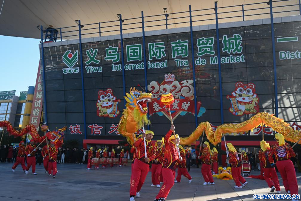 YIWU, 9. Februar 2025 (Xinhuanet) -- Ein Drachentanz wird auf einem Platz des internationalen Handelsmarktes Yiwu in Yiwu in der ostchinesischen Provinz Zhejiang aufgeführt, 9. Februar 2025. (Quelle: Xinhua/Huang Zongzhi)