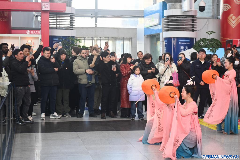 YIWU, 9. Februar 2025 (Xinhuanet) -- Menschen schauen sich eine Aufführung auf dem internationalen Handelsmarkt Yiwu in Yiwu in der ostchinesischen Provinz Zhejiang an, 9. Februar 2025. (Quelle: Xinhua/Huang Zongzhi)