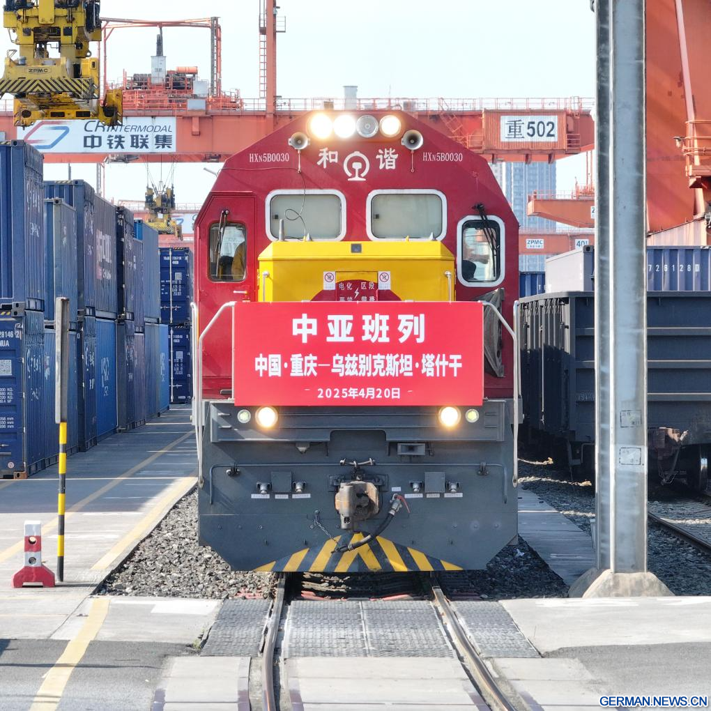 CHONGQING, 20. April 2025 (Xinhuanet) -- Die Luftaufnahme einer Drohne vom 20. April 2025 zeigt einen China-Zentralasien-Güterzug, der vom Bahnhof Tuanjiecun in Südwestchinas Chongqing abfährt. Ein mit Polyesterchips aus Südwestchinas Chongqing beladener Güterzug verließ am Sonntagmorgen die regierungsunmittelbare Stadt in Richtung Usbekistan, was die Einweihung einer neuen regelmäßigen Güterzugverbindung von Chongqing nach den zentralasiatischen Ländern markierte.