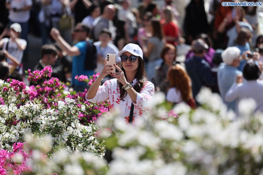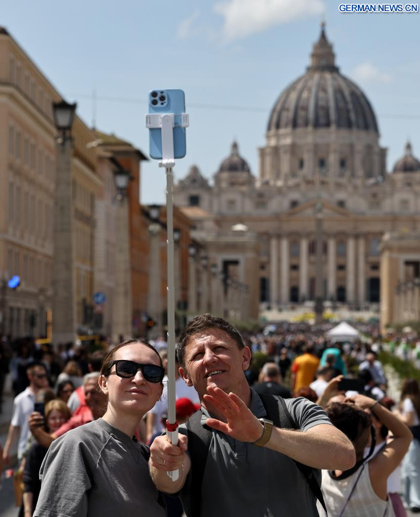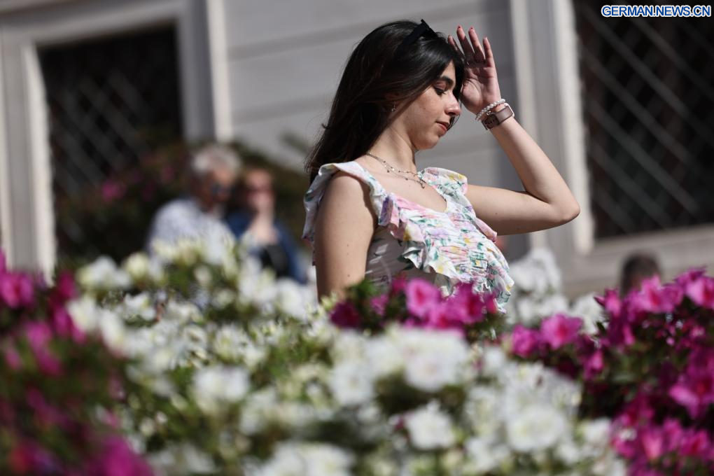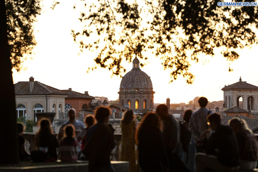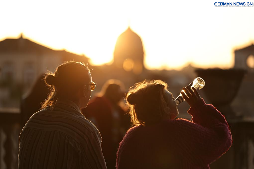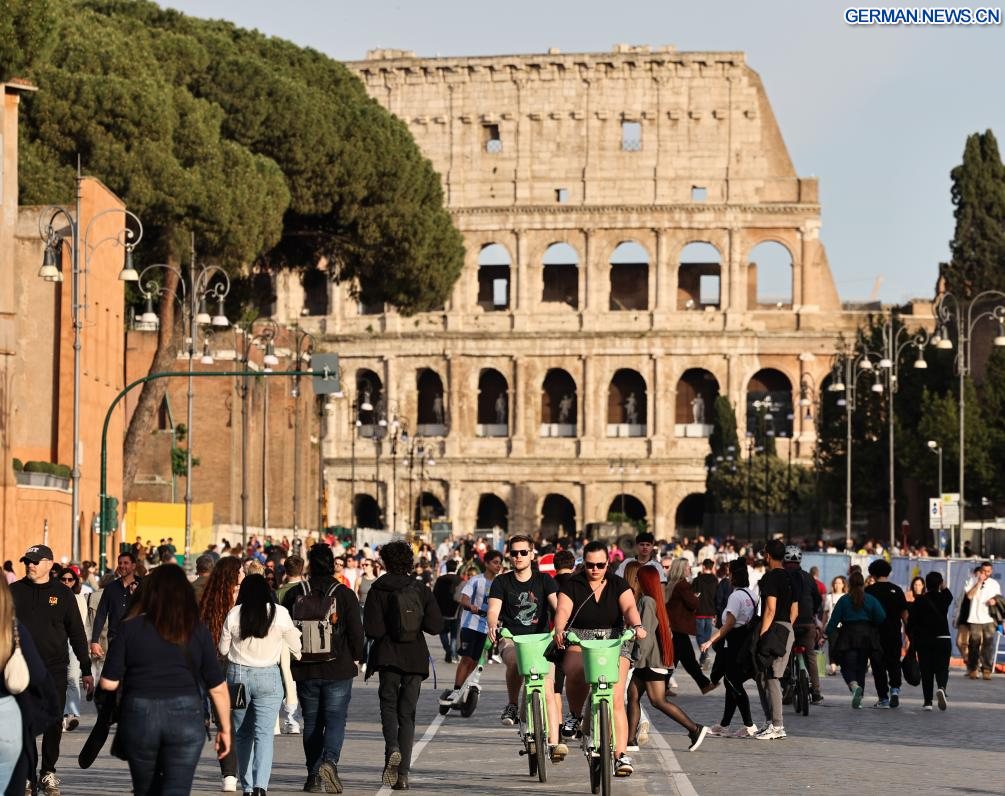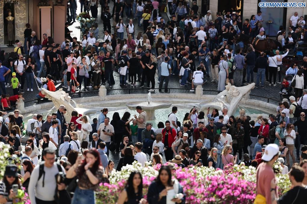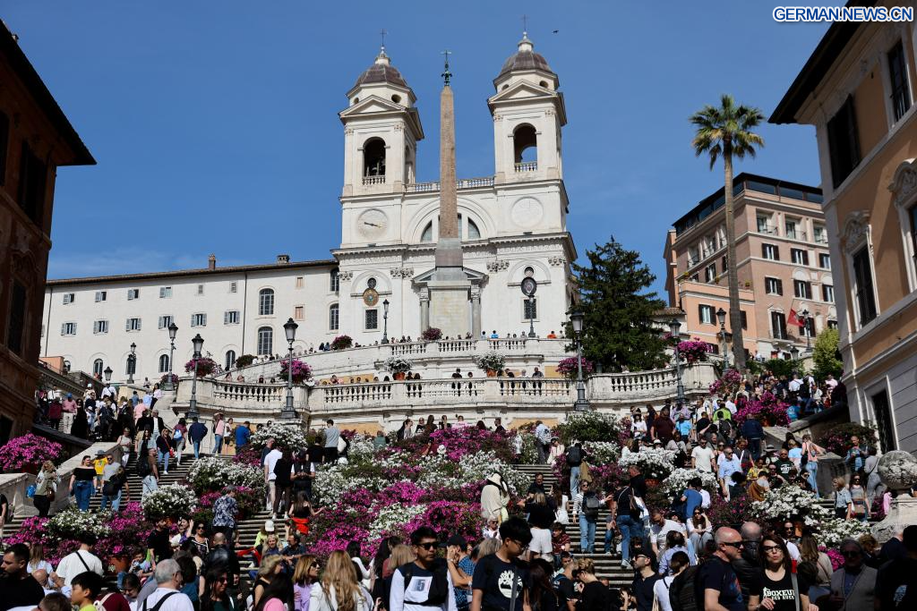 ROM, 22. April 2025 (Xinhuanet) -- Touristen genießen Freizeit während der Osterfeiertage an der Spanischen Treppe in Rom, Italien, 21. April 2025. (Quelle: Xinhua/Li Jing)