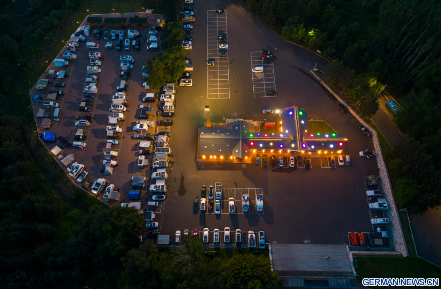 YICHUN, 3. Mai 2025 (Xinhua) -- Die Luftaufnahme einer Drohne zeigt einen Campingplatz für Freizeitfahrzeuge im Xing'an National Forest Park in Yichun in der nordostchinesischen Provinz Heilongjiang, 11. Juli 2024.