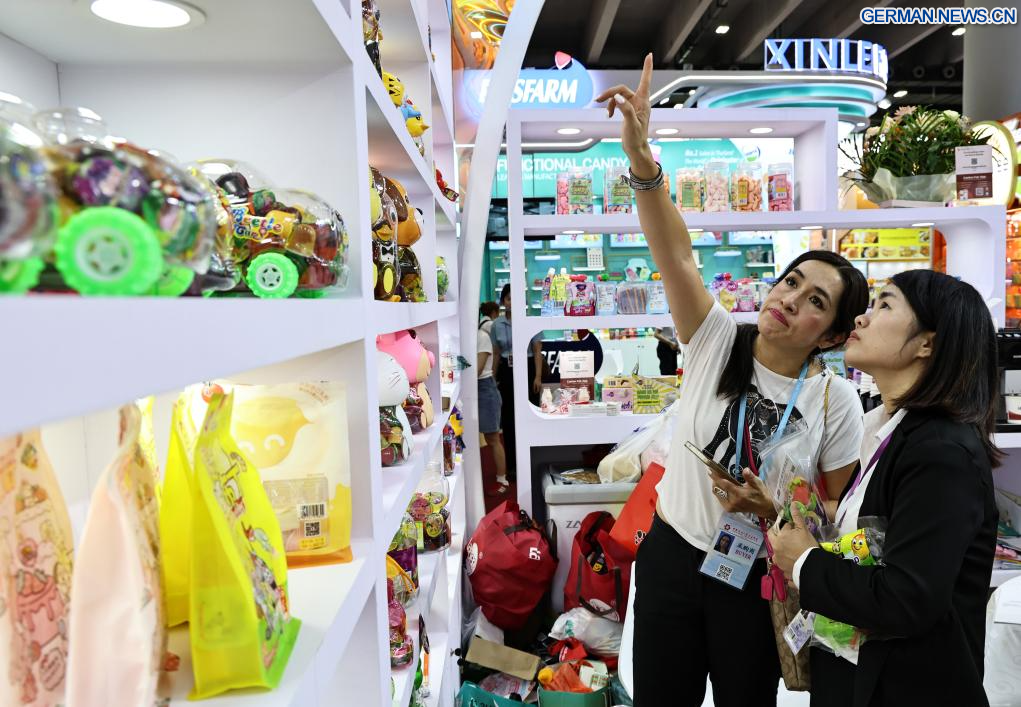GUANGZHOU, 5. Mai 2025 (Xinhuanet) -- Eine Einkäuferin wählt Lebensmittelprodukte auf der 137. China Import and Export Fair in Guangzhou in der südchinesischen Provinz Guangdong aus, 5. Mai 2025. (Quelle: Xinhua/Huang Guobao)