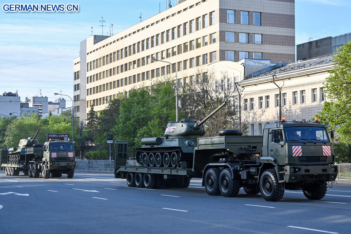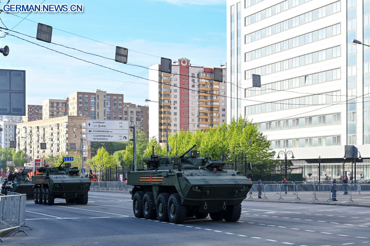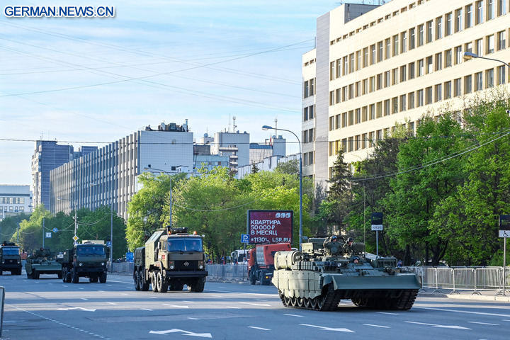 MOSKAU, 7. Mai 2025 (Xinhua) -- Fahrzeuge fahren durch die Innenstadt der russischen Hauptstadt Moskau, um an einer Probe für die Militärparade zum Tag des Sieges teilzunehmen, die an den 80. Jahrestag des Sieges im Großen Vaterländischen Krieg der Sowjetunion erinnert, 7. Mai 2025. (Xinhua/Cao Yang)