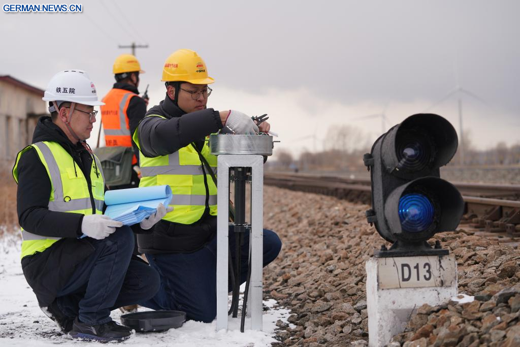 Arbeiter installieren Geräte auf der Baustelle des Kapazitätserweiterungsprojekts der Jiamusi-Tongjiang-Eisenbahn in der nordostchinesischen Provinz Heilongjiang, 29. März 2025.