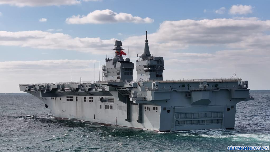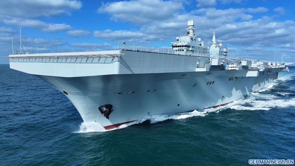 SHANGHAI, 16. November 2025 (Xinhuanet) -- Chinas erstes amphibisches Angriffsschiff vom Typ 076, das Schiff „Sichuan“, ist unterwegs, 15. November 2025. Das Schiff „Sichuan“ kehrte am Sonntag gegen 17 Uhr nach Abschluss seiner ersten Probefahrt auf See in die Werft in Shanghai zurück.
