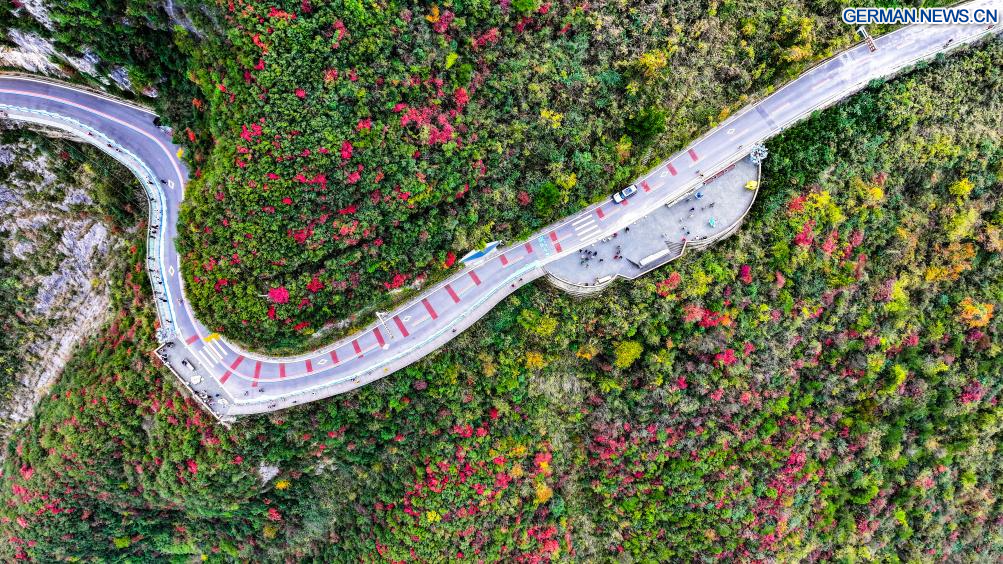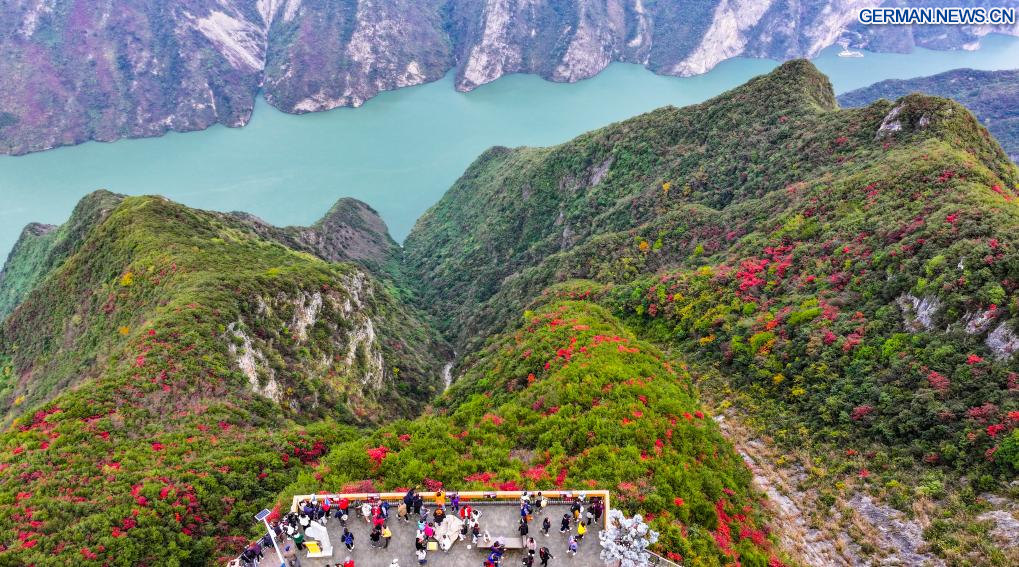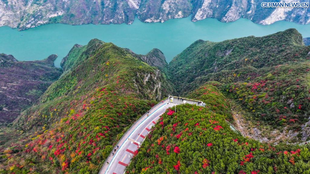 CHONGQING, 22. November 2025 (Xinhuanet) -- Die Luftaufnahme einer Drohne vom 22. November 2025 zeigt Touristen an einem landschaftlich reizvollen Ort, an dem sich die Bergvegetation in der Nähe der Wuxia-Schlucht, einer der Drei Schluchten am Jangtse, rot zu färben beginnt, im Kreis Wushan im südwestchinesischen Chongqing. (Quelle: Xinhua/Wang Quanchao)