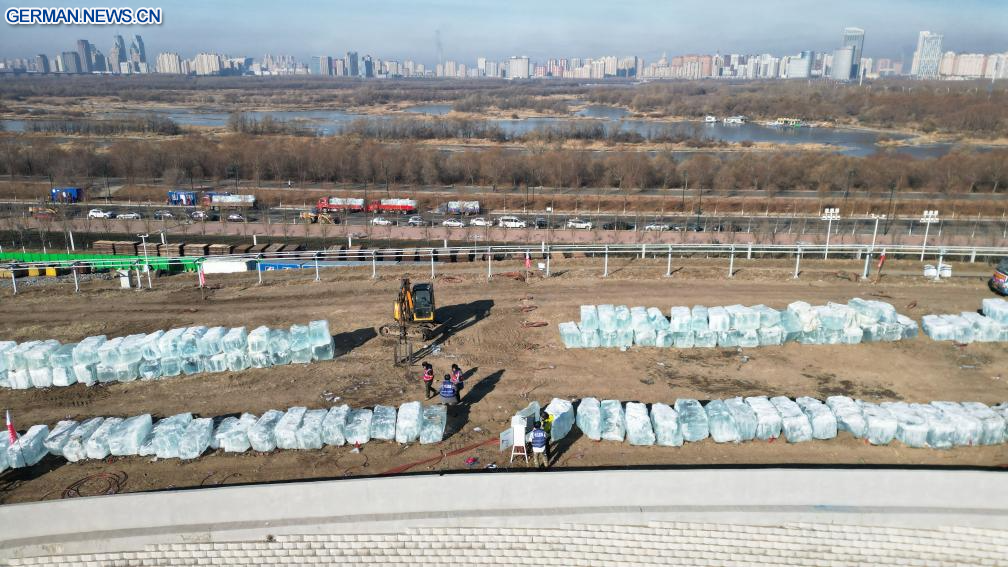 HARBIN, 25. November 2025 (Xinhuanet) -- Das am 25. November 2025 aufgenommene Luftbild einer Drohne zeigt die Baustelle der Harbin Ice-Snow World in Harbin in der nordostchinesischen Provinz Heilongjiang. Die 27. Harbin Ice-Snow World, ein renommiertes saisonales Themenpark in Harbin, hat am Dienstag offiziell mit dem Bau begonnen. (Foto von Liu Yang/Xinhua)