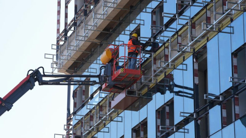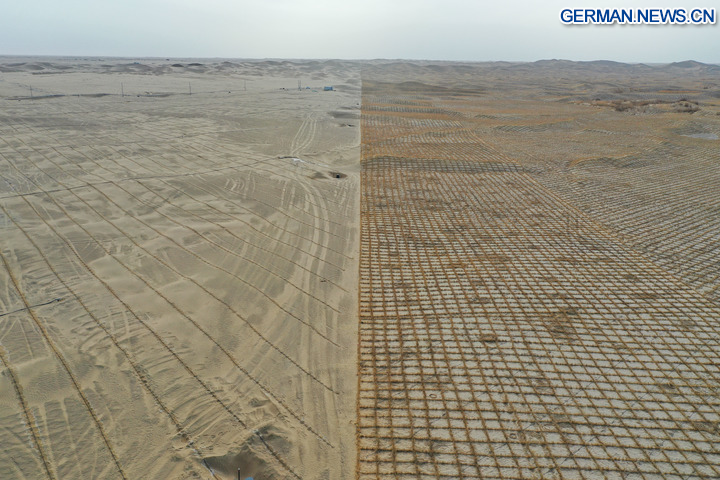 URUMQI, 30. November 2025 (Xinhua) -- Die Luftaufnahme einer Drohne zeigt schachbrettartige Sandbarrieren in einer Zone zur Sandkontrolle im Kreis Minfeng der Präfektur Hotan im Uigurischen Autonomen Gebiet Xinjiang im Nordwesten Chinas, 8. April 2025. (Xinhua/Ding Lei)