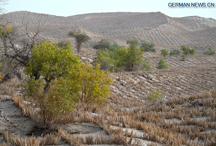 URUMQI, 30. November 2025 (Xinhua) -- Die Drohnenaufnahme zeigt wilde Pappeln und Grasflächen im Kreis Yuli der mongolischen Autonomen Präfektur Bayingolin im Uigurischen Autonomen Gebiet Xinjiang im Nordwesten Chinas, 19. September 2025. (Xinhua/Wang Fei)