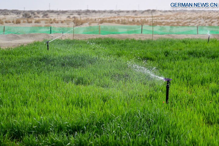 URUMQI, 30. November 2025 (Xinhua) -- Das Foto zeigt ein Weizenfeld im Kreis Shaya der Präfektur Aksu im Uigurischen Autonomen Gebiet Xinjiang im Nordwesten Chinas, das mit entsalztem Wasser bewässert wird, 13. April 2025. (Xinhua/Ding Lei)