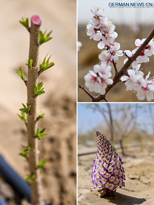 URUMQI, 30. November 2025 (Xinhua) -- Die Fotos zeigen einen Rosensämling (links) und eine Cistanche (unten rechts) in Pilotzonen zur Sandkontrolle im Kreis Yutian der Präfektur Hotan, 8. April 2025, sowie Aprikosenblüten (oben rechts) im Kreis Baicheng der Präfektur Aksu, 12. April 2025, im Uigurischen Autonomen Gebiet Xinjiang im Nordwesten Chinas. (Xinhua/Ding Lei)