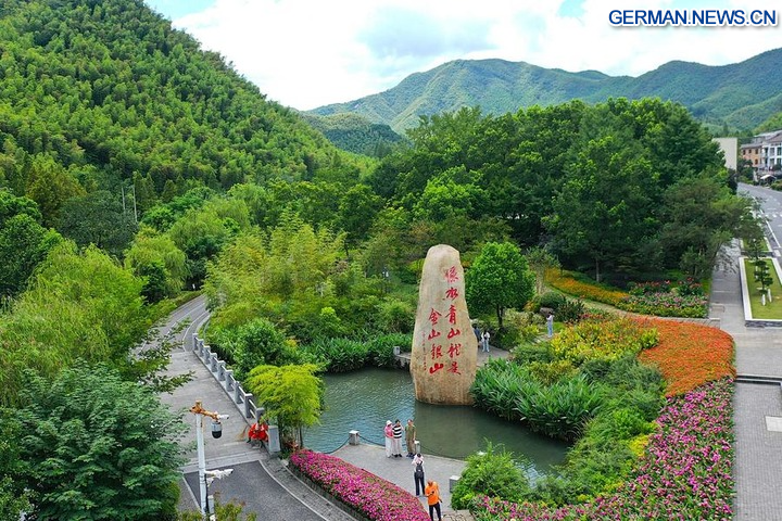 Die Luftaufnahme einer Drohne zeigt Touristen im Dorf Yucun im Kreis Anji der Stadt Huzhou in der Provinz Zhejiang in Ostchina, 6. August 2025. (Xinhua/Mao Zhu)
