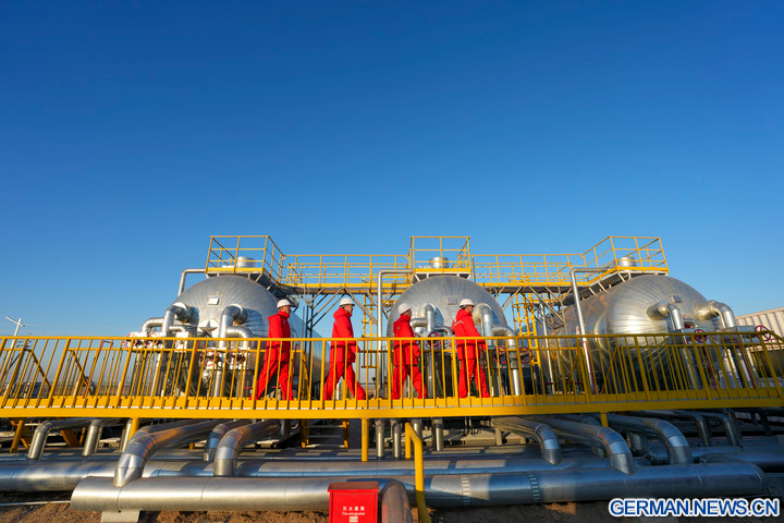 DAQING, 5. Dezember 2025 (Xinhua) -- Das Foto zeigt Arbeiter bei Inspektionsarbeiten an Öl- und Gasverarbeitungsanlagen in einer nationalen Demonstrationszone für kontinentales Schieferöl des Daqing-Ölfelds in Daqing in der Provinz Heilongjiang im Nordosten Chinas, 4. Dezember 2025. Das Daqing-Ölfeld, eine der größten Energieproduktionsstätten Chinas, gab am Freitag bekannt, dass die jährliche Schieferölproduktion in der Demonstrationszone eine Million Tonnen überschritten hat. (Xinhua/Wang Song)